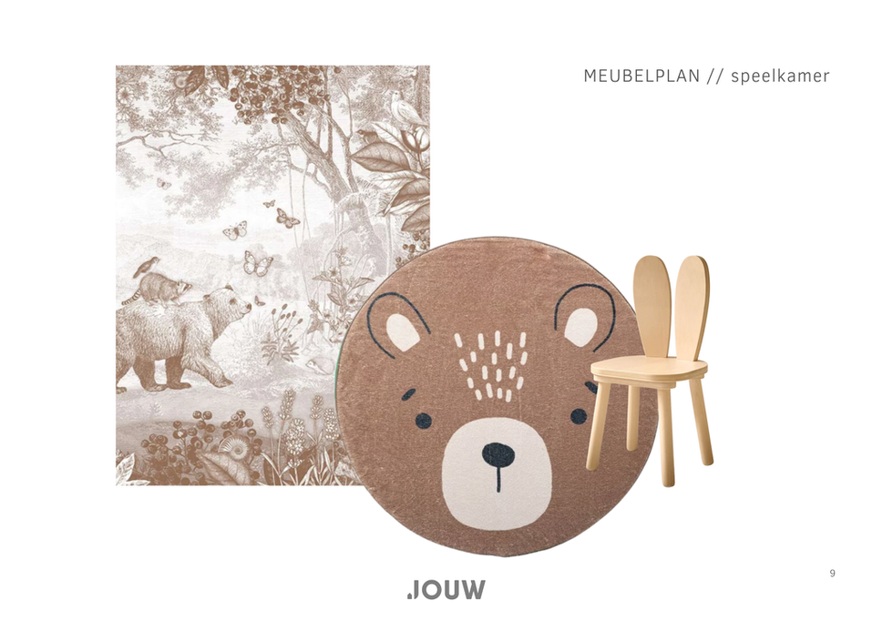 De eettafel heeft een centrale plek gekregen en vormt echt het hart van de woning. Daaromheen heb ik de zithoek en looproutes zo ingedeeld dat alles logisch in elkaar overloopt en er voldoende ruimte blijft om te spelen. Opbergruimte is zoveel mogelijk gesloten gehouden, zodat het geheel rustig oogt. Speelgoed heeft een eigen plek gekregen in de speelkamer, met extra bergruimte in de wandkasten en onder de trap.